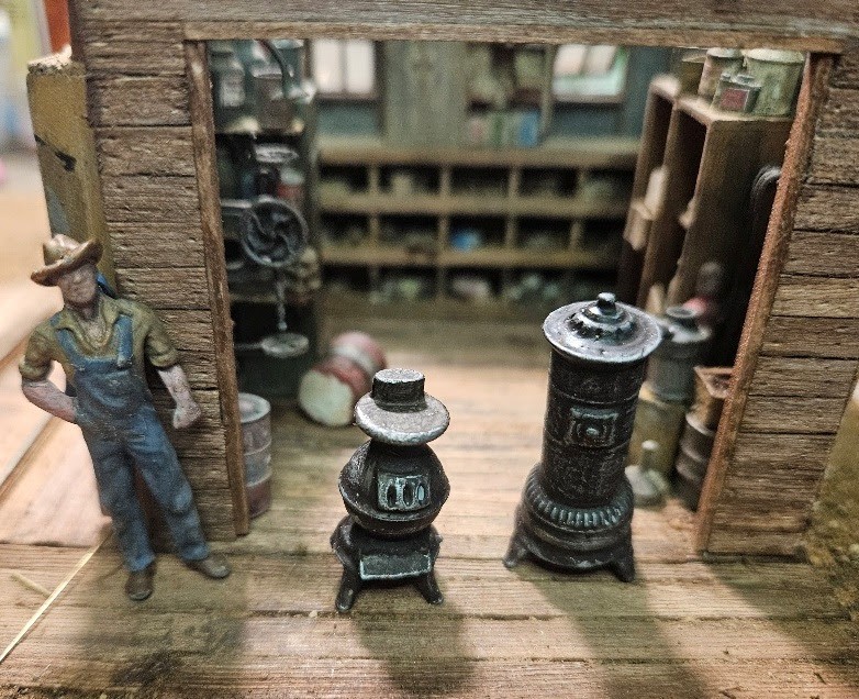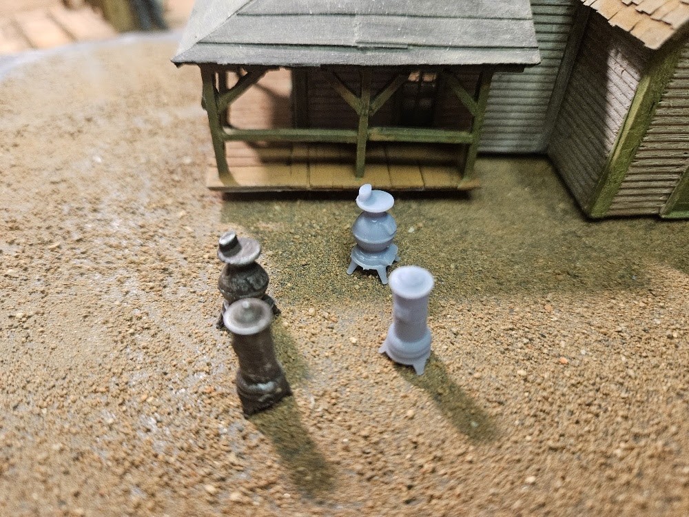 First Item are two different wood or coal burning stoves a potbelly and a larger heating stove and are both 3D printed. You get two of each stove for a total of four stoves. The stoves come unpainted unpainted.