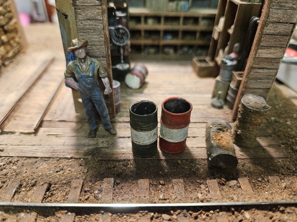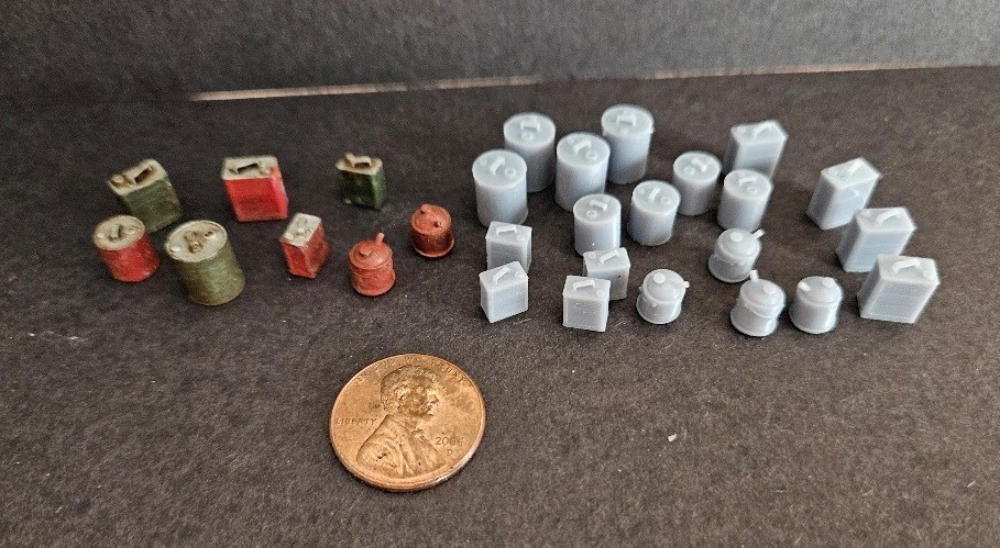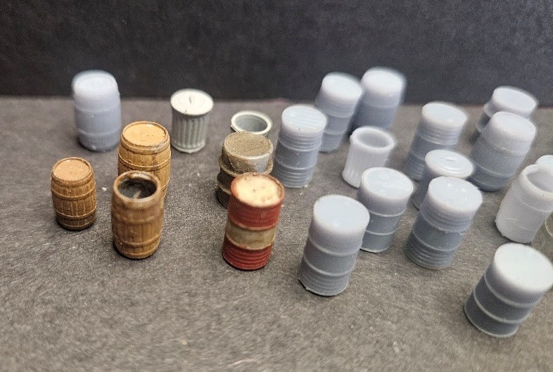 RRBS-H-01 - First item is a set of 3 different styles of oil drums, Wood barrels different sizes some open and closed and trash cans open and closed. You can see what the items look like painted. These are 3D printed and come unpainted.