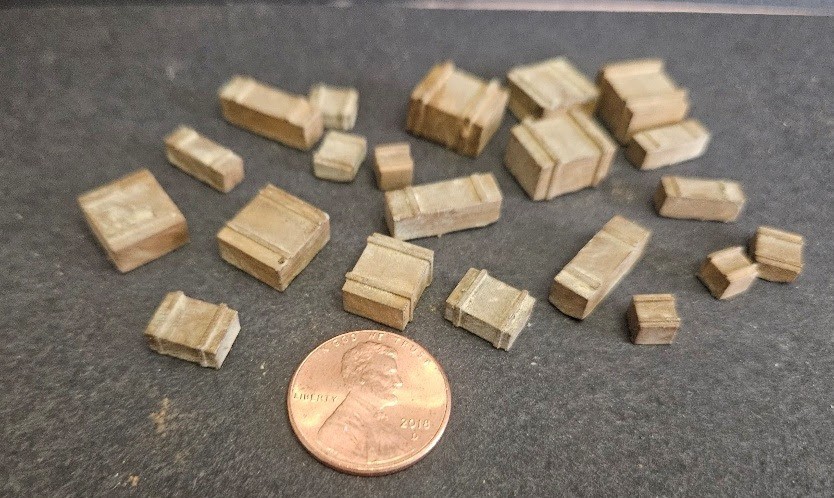 Second item we have 21 boxes 3 of each different sizes for your freight house or warehouse. You can see what the items look like painted. These are 3D printed and come unpainted.
