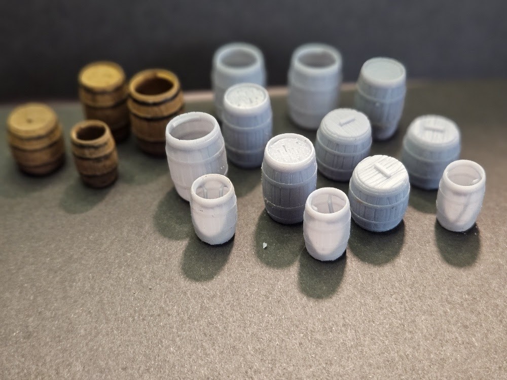 Second Item is a set of 3D printed wood Barrels and includes a pickle barrels. The set of 12 barrels total comes unpainted. In the pictures you can see what the wood barrels could look like painted.